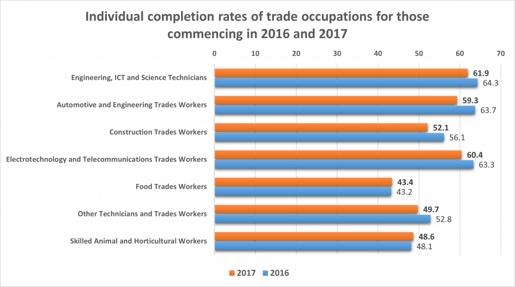 - 54.0% for trade occupations, down 3.0 percentage points from those commencing in 2016